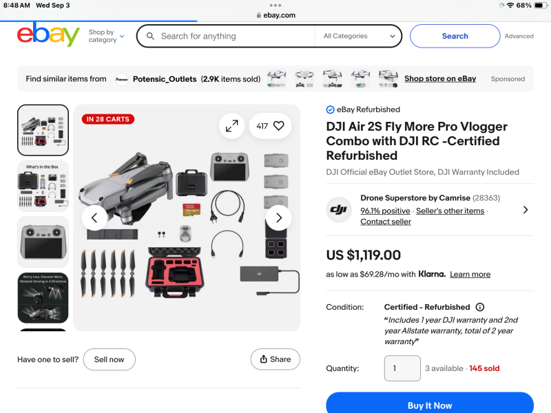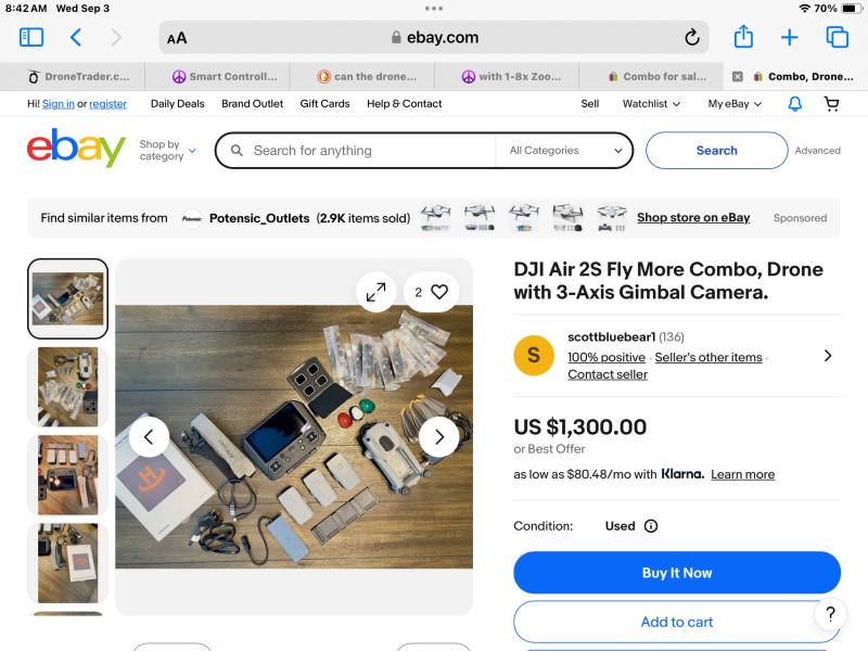 Includes: Air 2S drone, 3 flight batteries, multi hub and charger, camera gimble cover, ND camera filter kit, 2- sets of props.