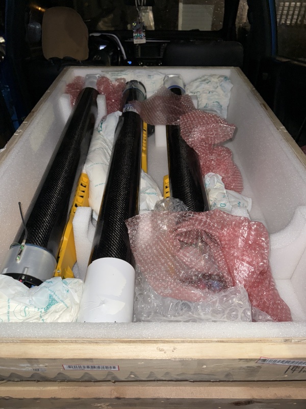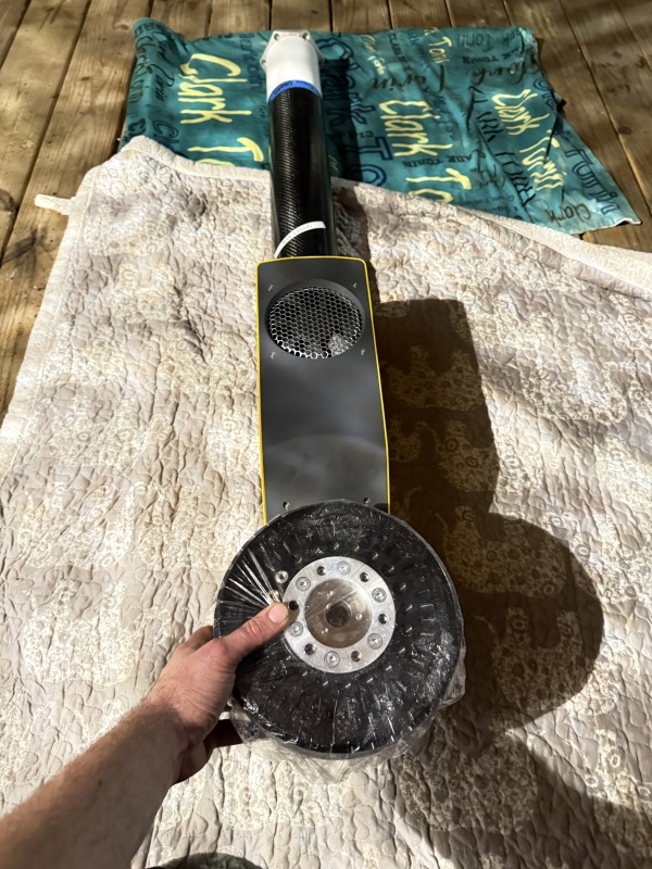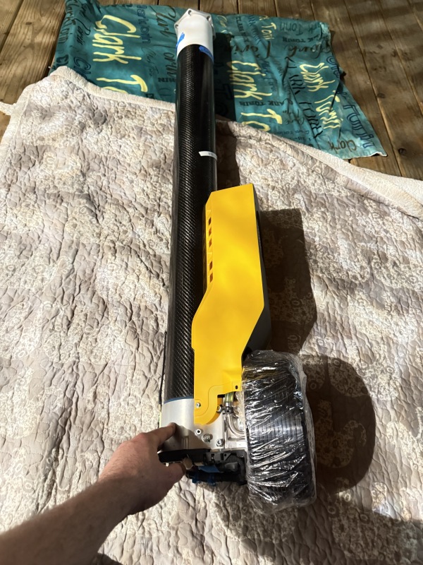 Four total arms, approx 48.5” long each with an emrax 208 MV liquid cooled motor on each arm. Each arm also has independent and completely self contained liquid cooling built in (yellow assembly on arm). Per website, peak output per motor is 86kw (115hp). From my understanding the guardian drone was only running them about half voltage off a dragon8 sevcon controller but the MV version of this motor is rated for up to 390v. The drone was over 500lbs with 200+lb payload.